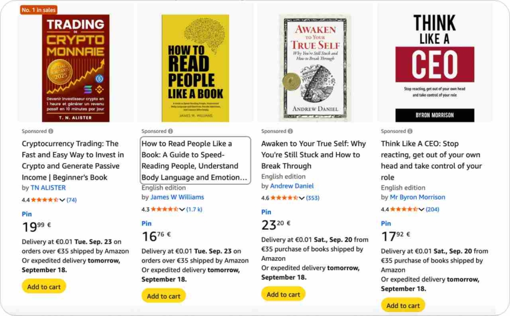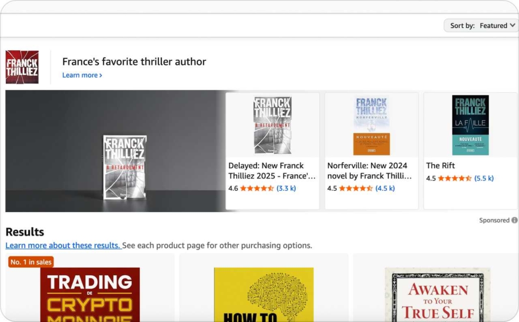 Amazon Sponsored Brands place a banner with multiple covers and a headline at the top of Amazon search results. This tactic drives readers into your Store or series page.