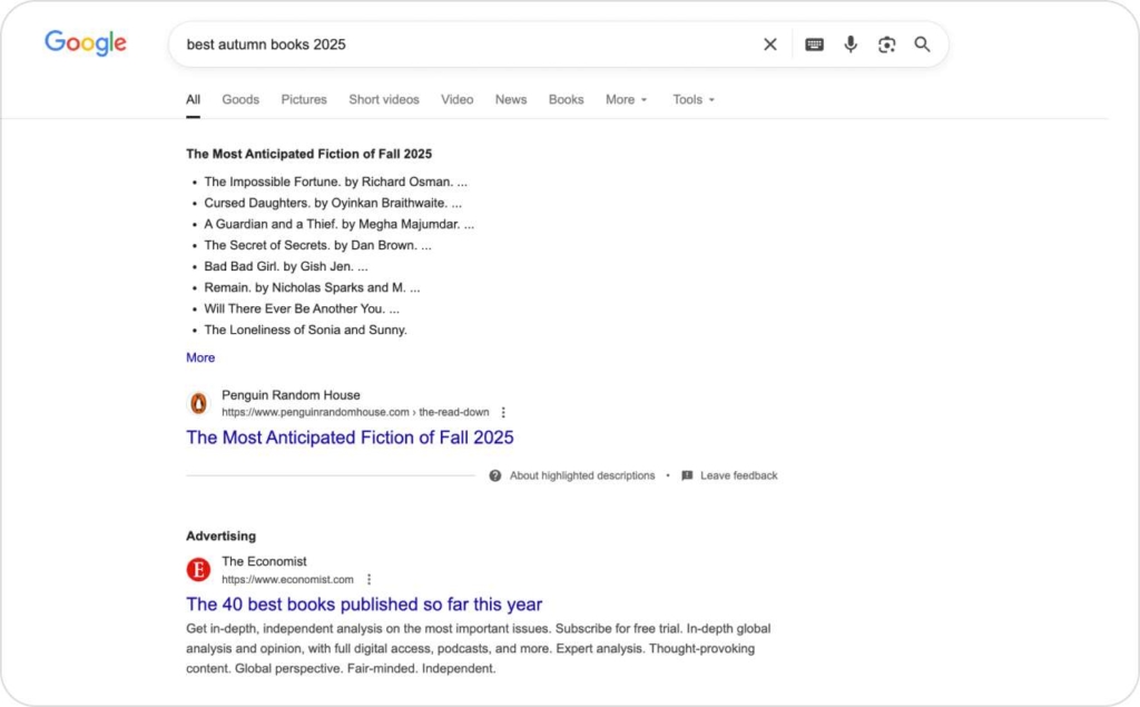 Responsive Search Ads on Google show your book to people typing direct queries like “books like Brandon Sanderson” or “best new cozy mystery 2025.”