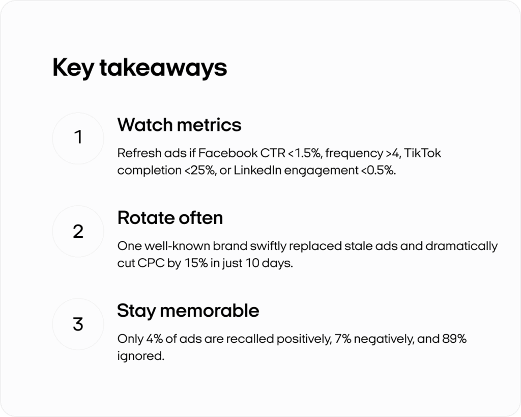 Once you spot these warning signs, pause your weakest performers and introduce fresh visuals or new copy right away. Even a small color shift can bring back the spark. Want a fact? Did you know that only 4% of advertising is remembered positively, 7% is remembered negatively, and 89% doesn’t get noticed? That’s why it’s important to regularly review your ads.