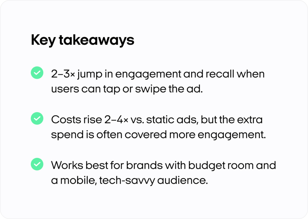 Many marketers see a jump in CTR and conversion rates in the first few days. That’s because interactive ads capture curiosity faster. They also stretch your spend further, delivering better returns on fewer impressions.