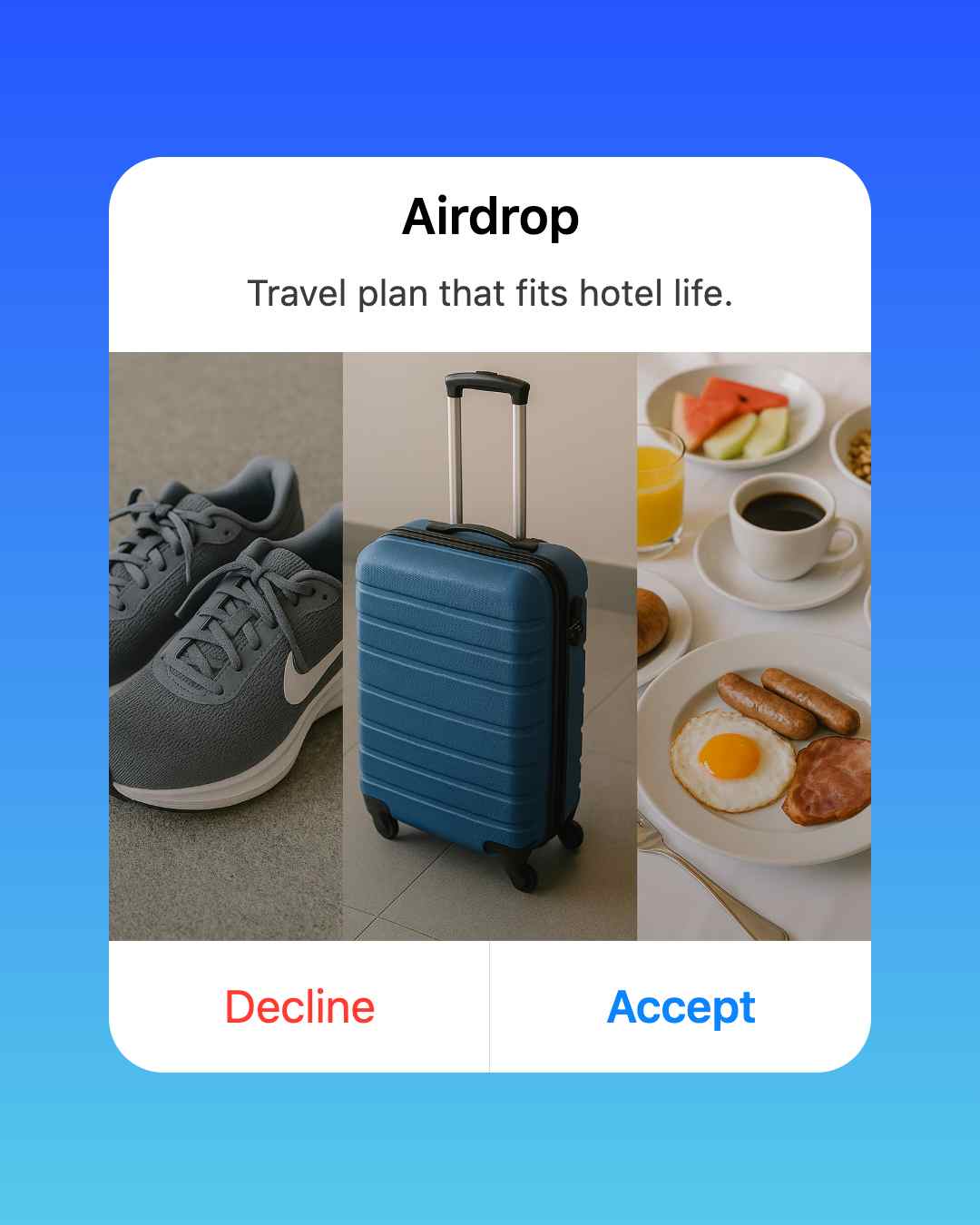 Feature visuals of sneakers, suitcase, and hotel breakfast with the headline “Travel plan that fits hotel life.” Landing page gives a one-week travel checklist and booking link for consults.